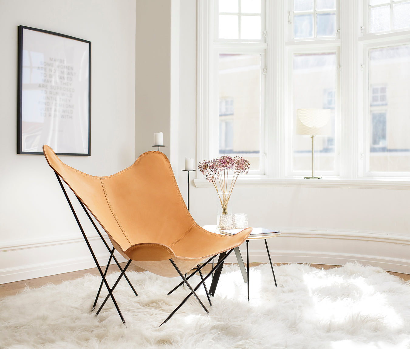 “バタフライチェア”の愛称でも知られる「BKFチェア」は、3人のアルゼンチン人デザイナー(アントニオ・ボネット、フアン・クルチャン、ホルヘ・フェラーリ=ハードイ)によってデザインされ、それぞれの頭文字をとってBKFチェアと名づけられました。彼らは20世紀を代表する建築家のル・コルビュジエの下で働いた経験を持ちますが、この椅子からはその影響はあまり感じられません。それよりも、イギリスのエンジニア、ヨゼフ・フェンビィが1855年にデザインした椅子にインスピレーションを得て、1938年に誕生しました。1950年代から60年代にかけて特に若者たちに支持され、その人気はイームズ夫妻にも勝るとも劣らないものでした。(私たちはCUEROの日本総販売元です。)