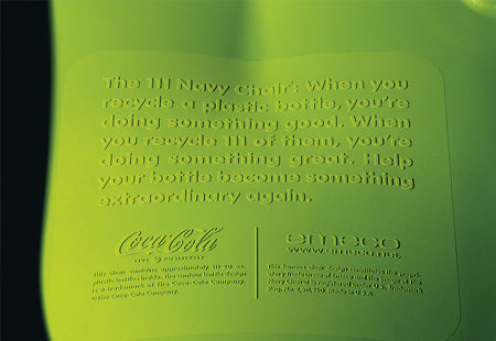 emeco社の椅子の製法は、それぞれの構成部品をつなぐための金具を使用する必要がありません。これがコピー商品をつくることを難しくしています。emeco社で使用するアルミニウムの約80-85%はリサイクルアルミニウムで、そのうちの半分はコークの缶です。