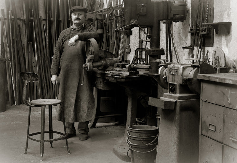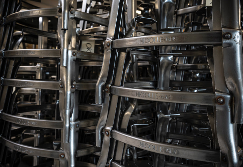 ポール・ヘンリー・ニコル(Paul-Henry Nicolle)によって、1913年にフランス・パリ近郊で創業を開始。エレガントな外観でありながら頑丈な椅子を作るため、スチールのプレス加工において沢山の実験を重ね、1933年に生まれたのが二コル・チェアでした。その後、労働者は機械から5フィート(約1.5m)離れて作業しなければならないという厳しい労働基準法が施行され、創業以来86年間続けられた生産体制の変更による大きな投資が必要となったニコルの工場は、突如として終わりを迎えました。そこから数年後の2004年、産業考古学者のジェローム・ルペール(Jérôme LEPERT)が、ニコル・チェアの製造に使われた工具や金型が放置されているのを発見しました。彼は、この一世を風靡した工業用チェアをフランスで製造・復活させることを計画しました。そして2009年、生産が再び開始されたニコル・チェアは瞬く間に人気となりました。